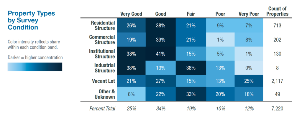- $23.8 million+ for Stabilization: At an estimated $15,000 per residential stabilization and $25,000 per commercial/industrial stabilization, bringing all poor and fair condition structures to a stable state would cost at least $23.8 million—with fair-condition residential properties alone accounting for at least $14.7 million of that total.