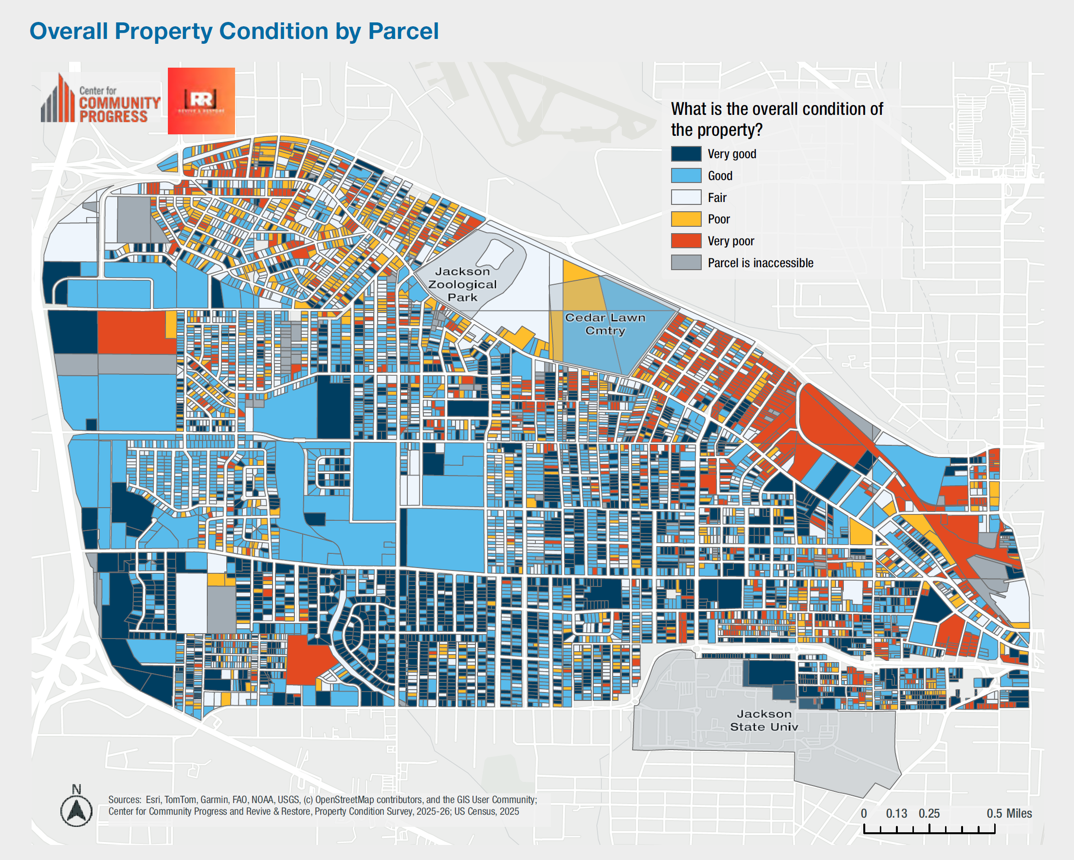 In fall 2025, Revive and Restore Community Corporation (a West Jackson neighborhood nonprofit), with the support of the Center for Community Progress, completed a property condition survey of 7,694 parcels in Jackson, Mississippi.